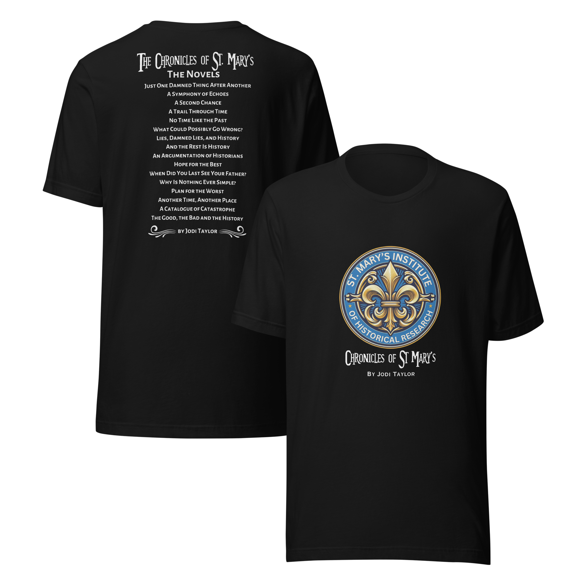 Let the world know about your favourite author with this band style t-shirt featuring the new St.Mary’s Logo on the front and a list of the Chronicles on the back.