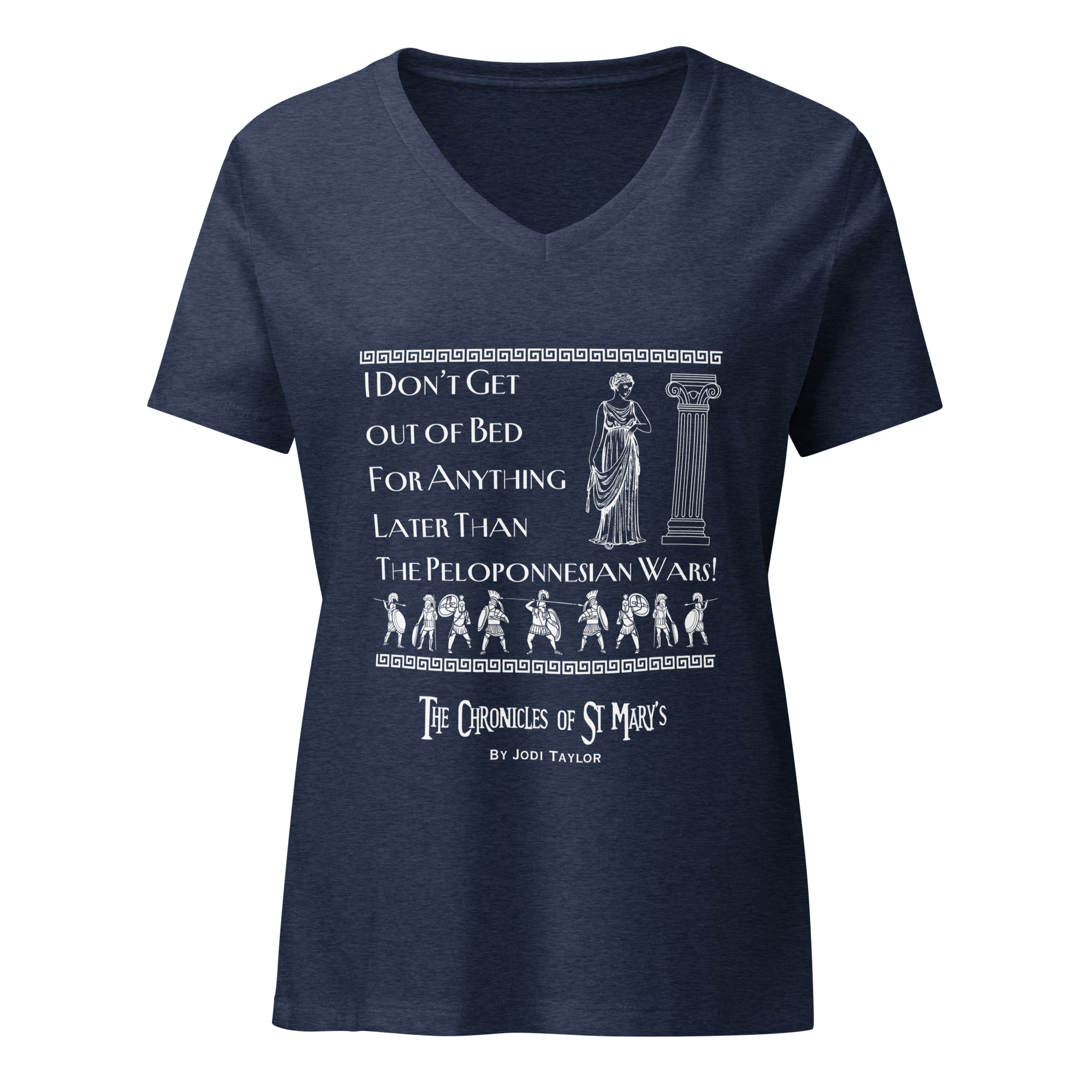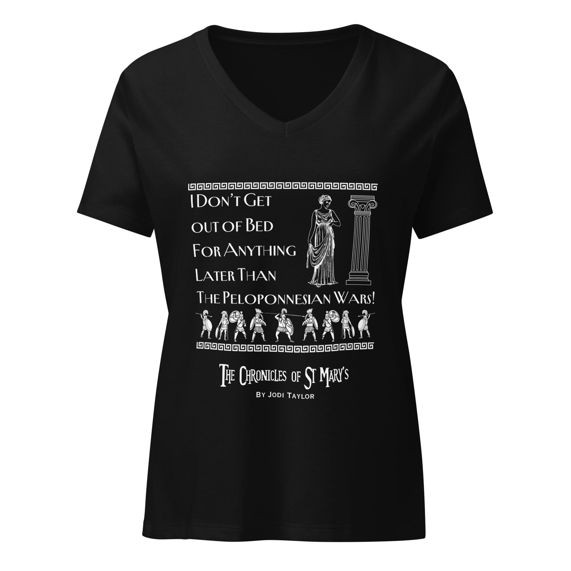 “I don’t get out of bed for anything later than the Peloponnesian Wars” Embrace ultimate comfort with this women’s V-neck t-shirt. Its soft fabric and relaxed fit make it ideal for a polished everyday look, with the V-neck adding a touch of style.